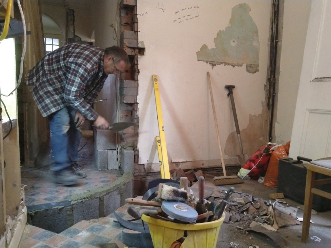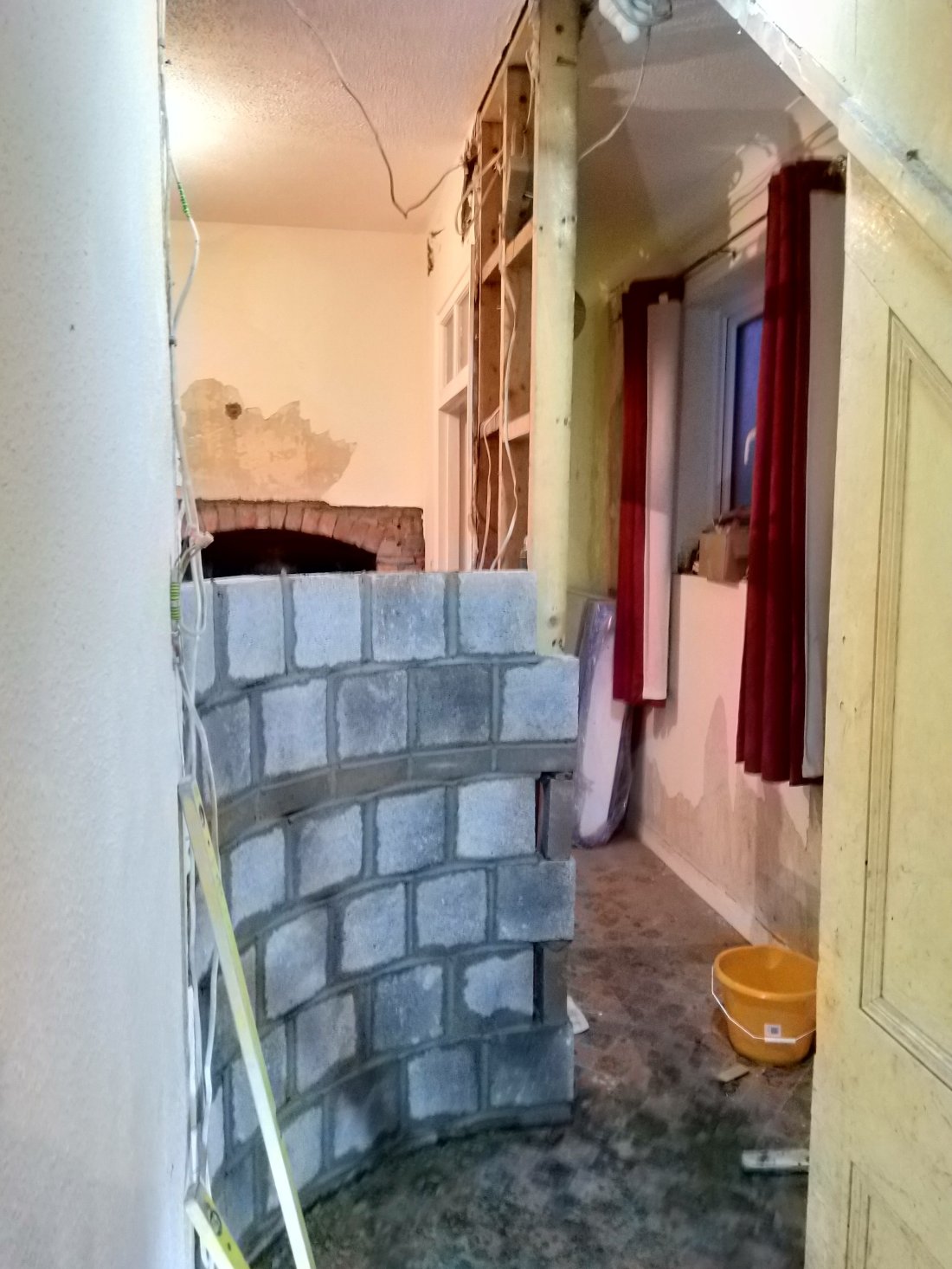 In the meanwhile the wall had made it to half way and mater had done a little more wallpaper stripping in the master bedroom. Getting there!